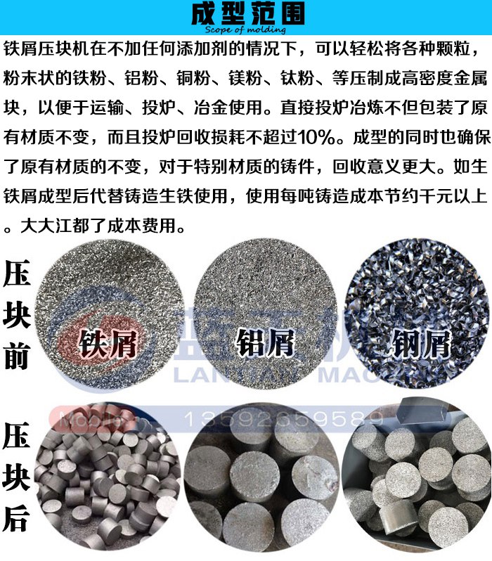 藍(lán)天機(jī)械鐵屑?jí)簤K機(jī)可以將各種鐵屑在不不加入任何粘合劑的情況下壓制成高密度圓柱形餅塊,根據(jù)原料的不同,壓制出餅塊的密度與重量也不相同,適用于鑄鋼廠、鑄鋁廠、鋁合金型材廠、汽配、五金等鑄造相關(guān)行業(yè)。