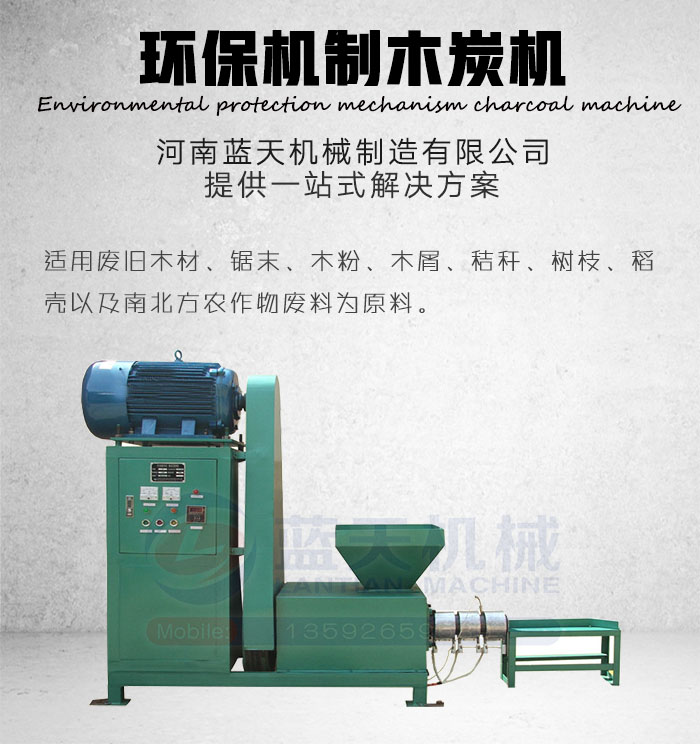 環(huán)保機(jī)制木炭機(jī)是以廢舊木材、鋸末、木粉、木屑、秸稈、樹枝、稻殼以及南北方農(nóng)作物廢料為原料,粉碎后經(jīng)環(huán)保機(jī)制木炭機(jī)高溫、高壓塑化后成型為機(jī)制木炭半成品,后經(jīng)炭化即為環(huán)保木炭。河南藍(lán)天機(jī)械制造有限公司是專業(yè)生產(chǎn)環(huán)保機(jī)制木炭機(jī)設(shè)備的廠家,咨詢環(huán)保機(jī)制木炭機(jī)價(jià)格請撥打官網(wǎng)熱線了解更多!